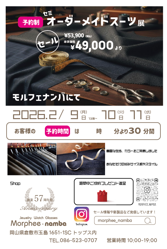 セミオーダースーツ展2026開催のお知らせ2月10日(火)11日(水)